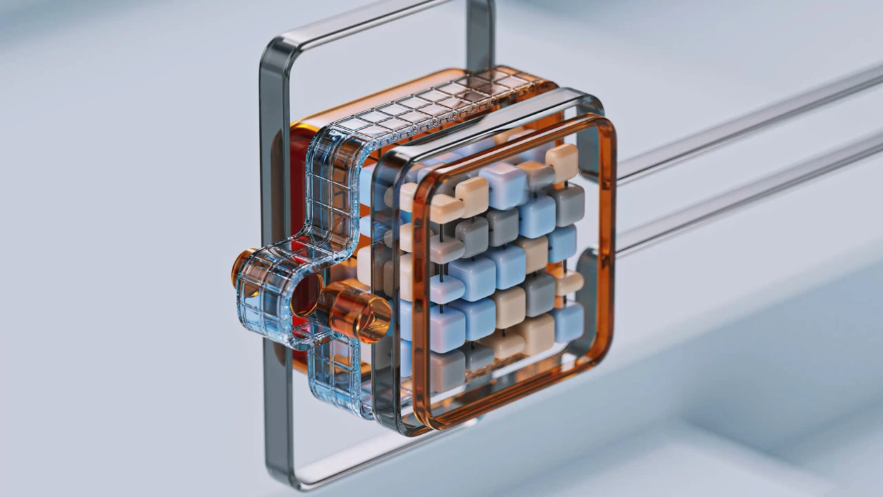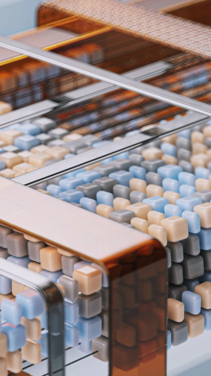 A digital artwork featuring a series of interconnected transparent beams, with small multicolored cubes (mostly blue and beige) arranged inside, creating a futuristic, grid-like pattern.